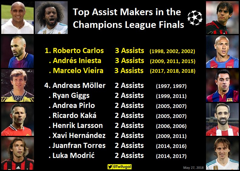 - "Top Assist Makers of the in the Champions League Finals". Twitugal. 27 May 2018. مؤرشف من الأصل في 17 ديسمبر 2019.