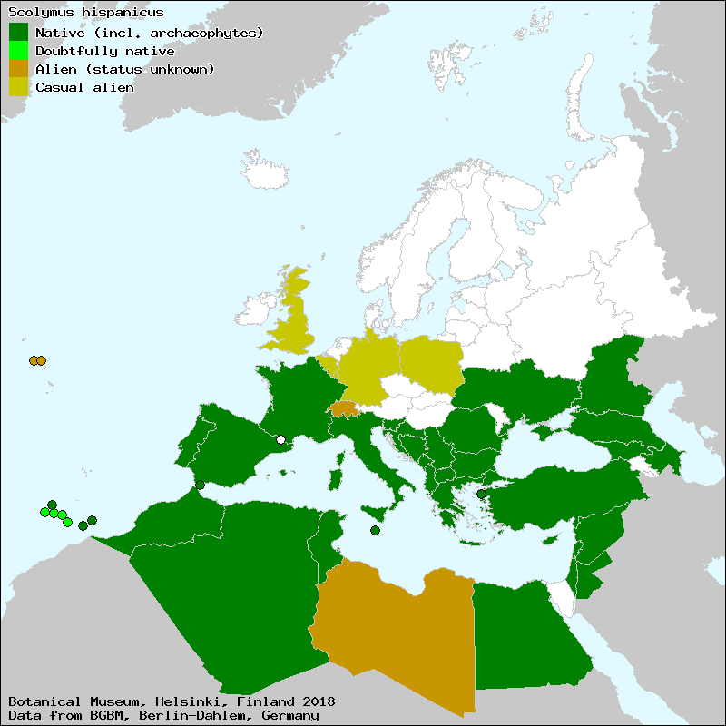 4. قاعدة البيانات الأوروبية-المتوسطية للنباتات. خريطة انتشار السكوليمس الإسباني (بالإنكليزية). تاريخ الولوج 29 حزيران 2013. نسخة محفوظة 09 يناير 2018 على موقع واي باك مشين.