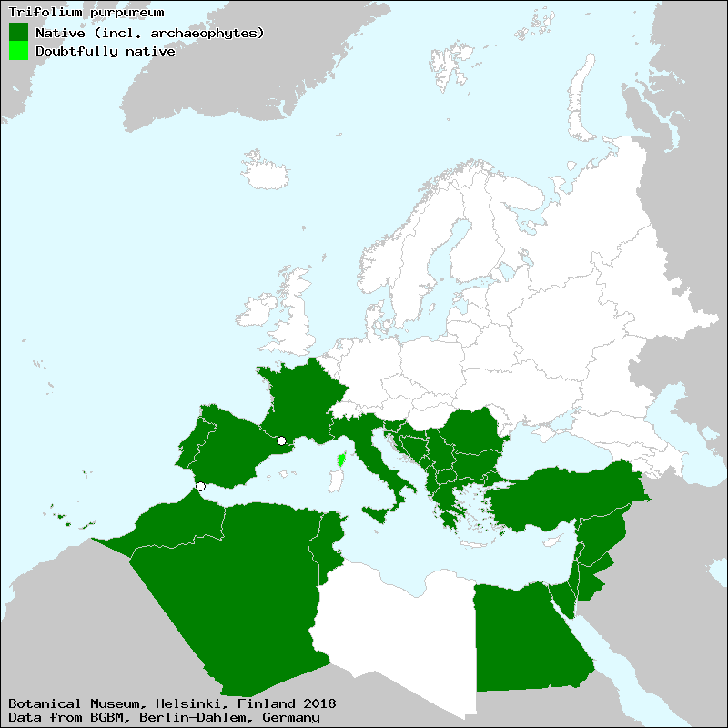 1. قاعدة البيانات الأوروبية-المتوسطية للنباتات.خريطة انتشار النفل الأرجواني (بالإنكليزية). تاريخ الولوج 19 تشرين الثاني 2012. نسخة محفوظة 09 أغسطس 2017 على موقع واي باك مشين.